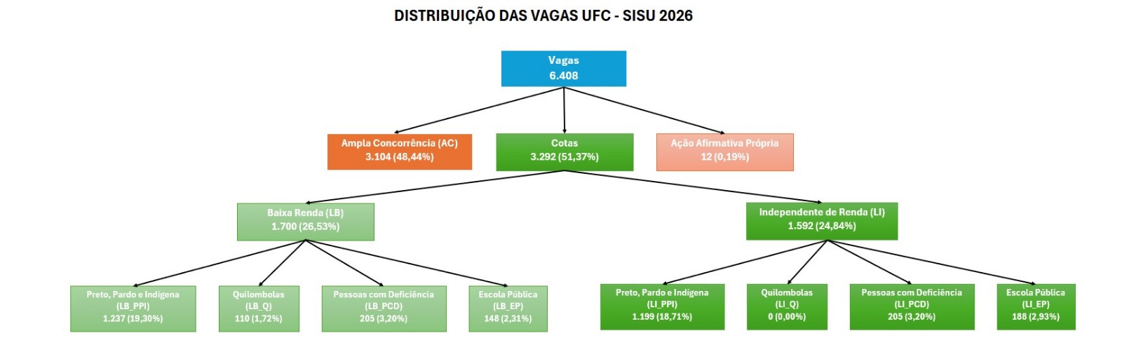 Assim como as demais instituições federais de ensino superior vinculadas ao Ministério da Educação, a Universidade Federal do Ceará (UFC) aplica a Lei de Cotas em suas vagas ofertadas no Sistema de Seleção Unificada (SISU).