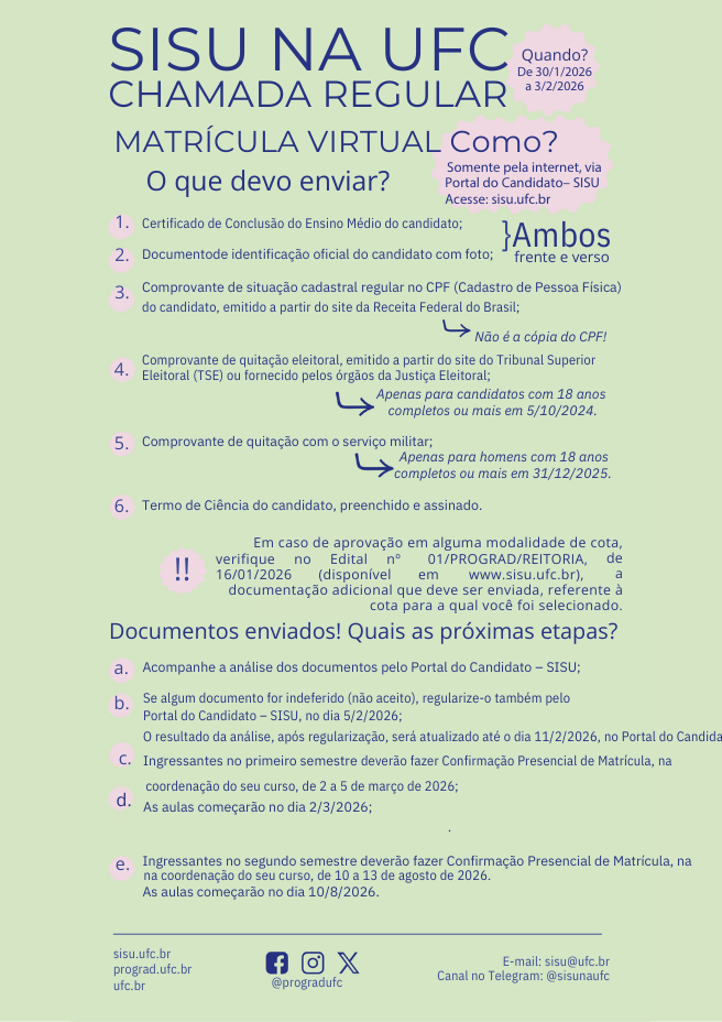 Data da publicação: 2 de fevereiro de 2026 Categoria: Notícias, Notícias do SISU 2026A Universidade Federal do Ceará (UFC), por meio da Coordenação do Sisu na UFC, divulga a lista dos convocados na Chamada Regular do Sistema de Seleção Unificada (Sisu) na Universidade Federal do Ceará (UFC), edição 2026.